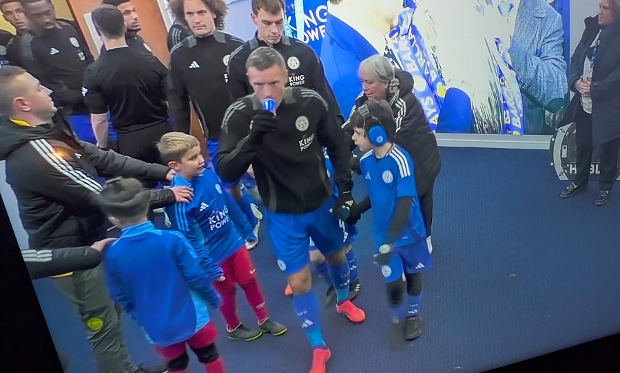 Yes that is Jamie Vardy skulling a can of Red Bull before a Premier League game