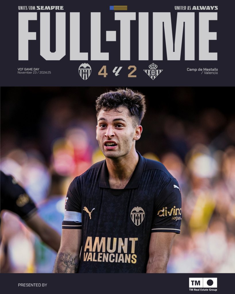 Σε πολύ βαριά ατμόσφαιρα, η Βαλένθια υποδέχτηκε την Μπέτις, δίνοντας το πρώτο της παιχνίδι, μετά τις 27 Οκτωβρίου, και τις φονικές πλημμύρες που έπληξαν την ισπανική πόλη. Οι ποδοσφαιριστές του Ρούμπεν Μπαράχα βρήκαν τα κουράγια και, χάρη σε ένα εξάλεπτο ξέσπασμα στην επανάληψη, κατάφεραν να νικήσουν 4-2 και να πανηγυρίσουν τη δεύτερη νίκη τους, σε 14 αγωνιστικές. Αποτέλεσμα που τη βγάζει, προσωρινά, από την τελευταία θέση.
