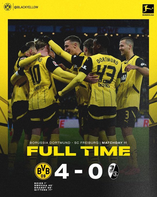 Εντός είναι αλλιώς για την Ντόρτμουντ η οποία επέστρεψε στις νίκες και καθάρισε εύκολα με 4-0 την τραγική Φράιμπουργκ. Με 9 παίκτες ολοκλήρωσαν την αναμέτρηση οι φιλοξενούμενοι.