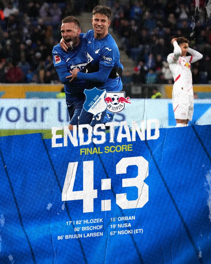 Σε ένα απίθανο ματς στην έδρα της Χοφενχαϊμ, η Λειψία παρά το γεγονός πως προηγήθηκε 3 φορές δεν κατάφερε να κερδίσει και δέχθηκε πικρή ήττα με 4-3 στο ντεμπούτο του Ίλτσερ στον πάγκο της Χοφενχαϊμ.