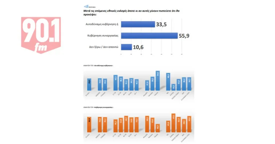 Αναφορικά με την κυβέρνηση που θα προκύψει από τις επόμενες βουλευτικές εκλογές οι ψηφοφόροι βλέπουν κυβέρνηση συνεργασίας σε ποσοστό 55,9% των ερωτηθέντων, ενώ 33,5% αυτοδύναμη κυβέρνηση.