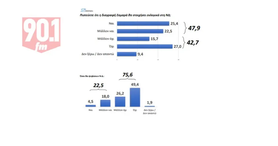 Όσον αφορά το κόστος από την απόφαση του πρωθυπουργού, οι ερωτηθέντες ήταν μοιρασμένοι, ωστόσο περισσότεροι, το 47,9%, πιστεύουν ότι η διαγραφή Σαμαρά θα κοστίσει εκλογικά στη ΝΔ, ενώ το 42,7% εκτιμά ότι «μάλλον όχι».