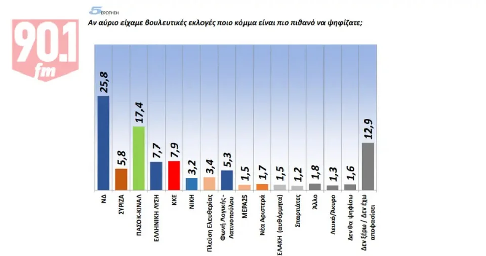 Στο ερώτημα «Ποιο κόμμα θα ψηφίζατε αν αύριο είχαμε βουλευτικές εκλογές» η ΝΔ έρχεται πρώτη με ποσοστό 25,8% και το ΠΑΣΟΚ-ΚΙΝΑΛ δεύτερο με 17,4%. Στην τρίτη θέση, ωστόσο, έρχεται πλέον το ΚΚΕ με 7,9%, ενώ τέταρτη με ελάχιστη διαφορά έρχεται η Ελληνική Λύση με 7,7%.