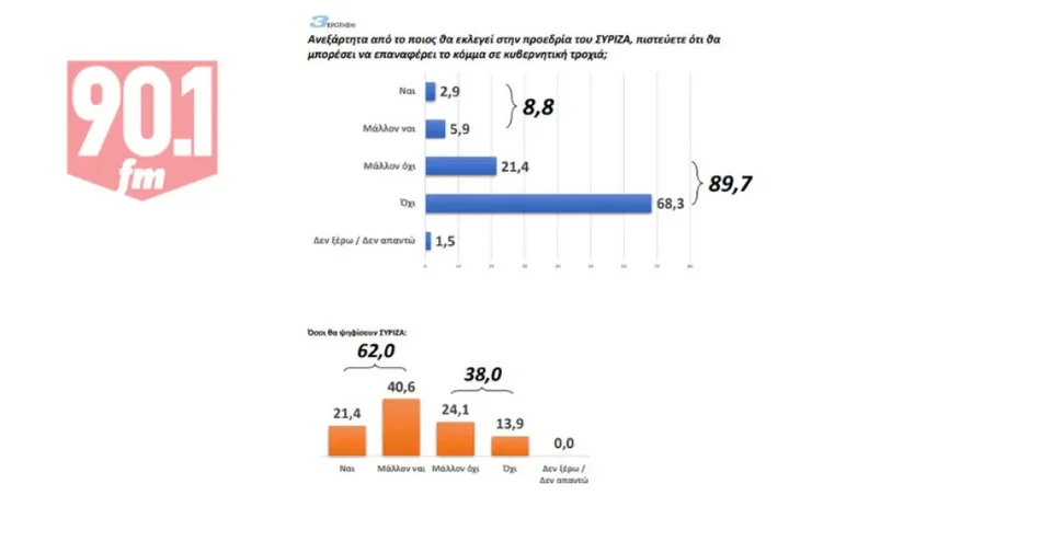 Το 89,7% πιστεύει ότι ο ΣΥΡΙΖΑ δεν θα μπορέσει να επανέλθει σε κυβερνητική τροχιά ανεξάρτητα από το ποιος είναι στην προεδρία του.