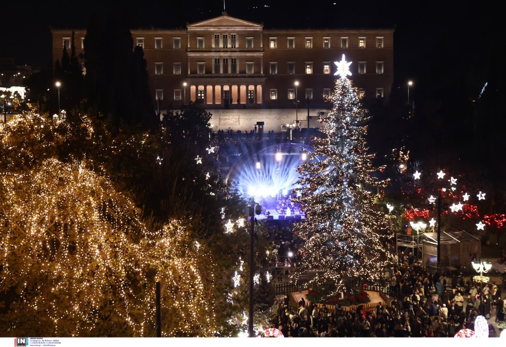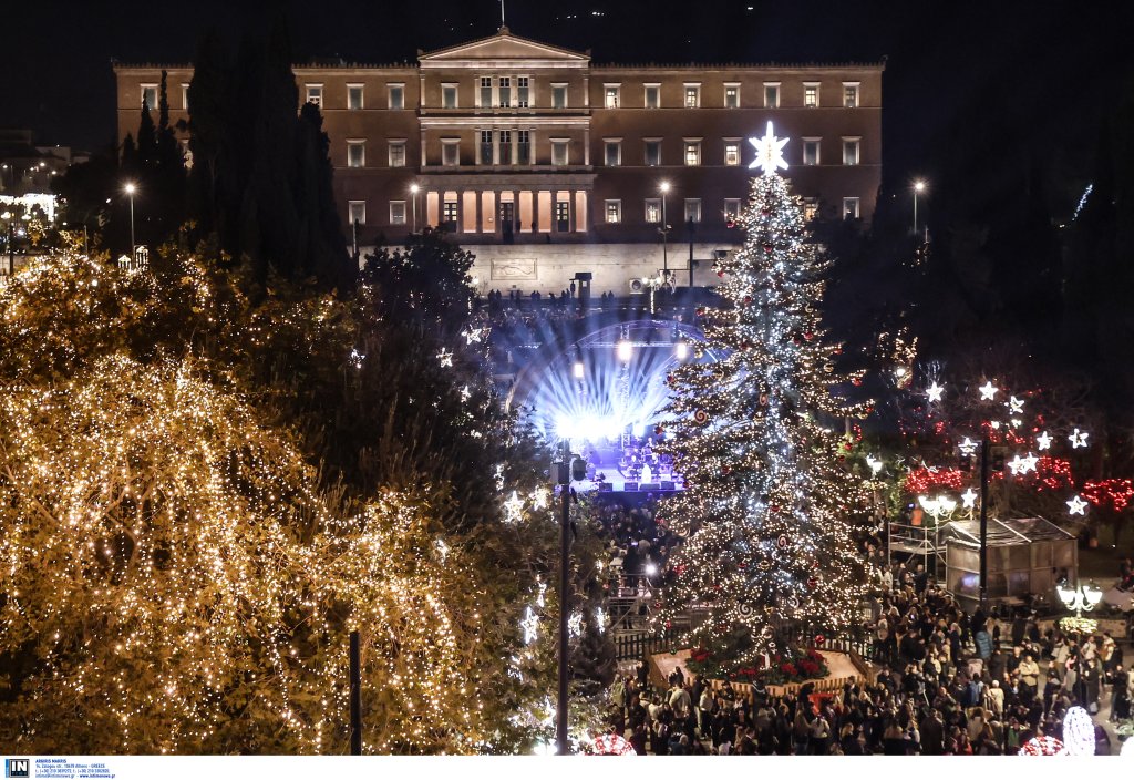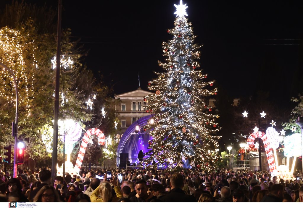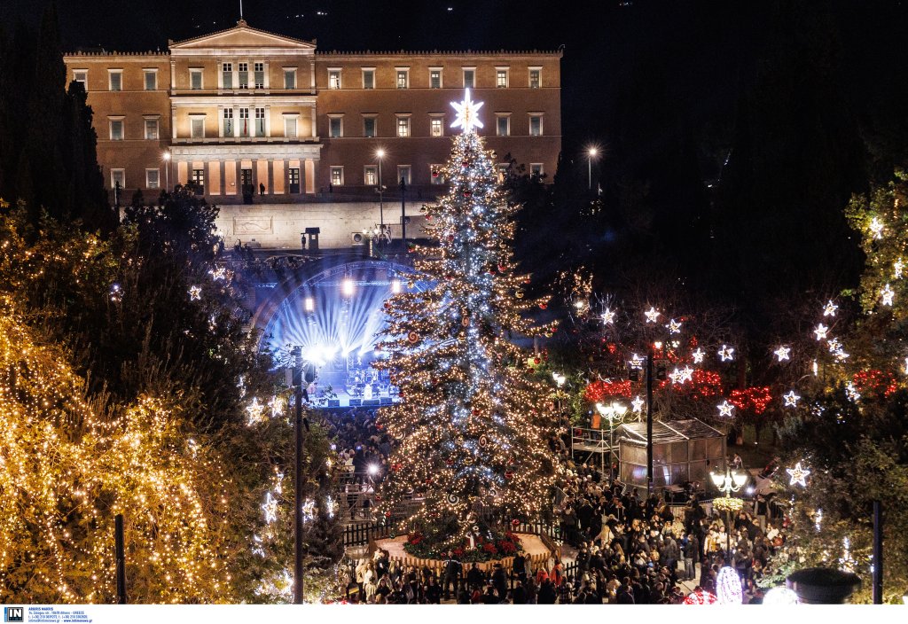 Το έλατο 20 μέτρων έφτασε στην Αθήνα από τον Ταξιάρχη Χαλκιδικής. Την εκδήλωση παρουσίασε η Νάνσυ Ζαμπέτογλου και ο Θανάσης Αναγνωστόπουλος ενώ η Νεφέλη Φασουλή και η Athens Big Band «χρωματίζουν» την πλατεία με χριστουγεννιάτικες μελωδίες.