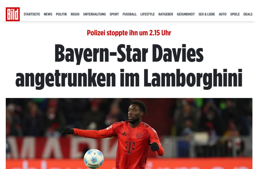 Σύμφωνα με την γερμανική εφημερίδα Bild η αστυνομία του Μονάχου σταμάτησε της πρώτες πρωινές ώρες της Παρασκευής το όχημα του Αλφόνσο Ντέιβις. Ο μπακ της Μπάγερν οδηγούσε τη Λαμποργκίνι και το αλκοτέστ χτύπησε… κόκκινο. Οι πληροφορίες αναφέρουν ότι ο Ντέιβις συνελήφθη, μεταφέρθηκε στο τμήμα και στη συνέχεια αφέθηκε ελεύθερος. Του αφαιρέθηκε ήδη το δίπλωμα.
