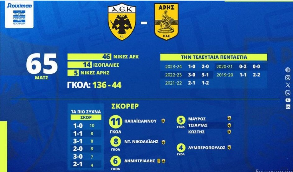 Αήττητη είναι η ΑΕΚ στα οκτώ τελευταία παιχνίδια της με τον Άρη στο πρωτάθλημα και στις δύο έδρες. Οι Κιτρινόμαυροι έχουν επτά νίκες και μια ισοπαλία. Ουσιαστικά δεν έχουν ήττα και στις αναμετρήσεις τους για το Κύπελλο Ελλάδος, αφού η περσινή κόντρα τους μετά από δύο ισοπαλίες, κρίθηκε στα πέναλτι. Αυτή τη σεζόν οι δύο ομάδες έχουν συναντηθεί ήδη για το θεσμό του Κυπέλλου Ελλάδος, με την ΑΕΚ να επικρατεί με 1-0 στις 30 Οκτωβρίου για τη φάση των «16» χάρη στο γκολ του Μαρσιάλ.