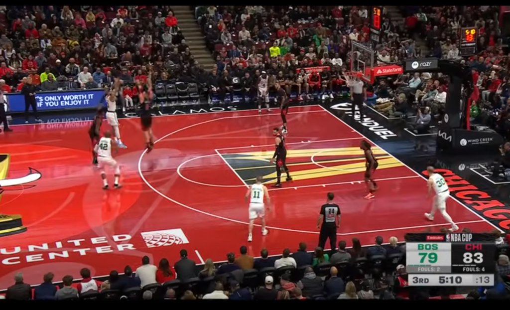 Για πρώτη φορά στη σεζόν, οι Μπόστον Σέλτικς παρατάχθηκαν με πλήρες ρόστερ και νίκησαν, εκτός έδρας, 138-129 τους Σικάγο Μπουλς, για το NBA Cup, έχοντας 23/54 τρίποντα. Προς τα τέλη της πρώτης περιόδου, οι πρωταθλητές Σέλτικς πήραν προβάδισμα 13 πόντων, 20-33, οι Μπουλς ανέβασαν την απόδοσή τους, έκαναν πολύ καλό δεύτερο 12λεπτο, όπου προηγήθηκαν και με +9, με το ημίχρονο να ολοκληρώνεται με τις δυο ομάδες ισόπαλες, 67-67. Το ντέρμπι συνεχίστηκε και στην επανάληψη, με Μπουλς και Σέλτικς να πηγαίνουν χέρι-χέρι στο σκορ, 96-96 στο 36ο λεπτό, σε ένα παιχνίδι που, τελικά, κρίθηκε με ένα ξέσπασμα των φιλοξενούμενων. Με το σκορ στο 108-108, οι Σέλτικς έκαναν επιμέρους 11-4 και προηγήθηκαν 112-119, με 5:25 λεπτά πριν το φινάλε. Στη τέταρτη περίοδο, η ομάδα της Βοστώνης είχε 15/23 σουτ και καθοριστικό τον Πέιτον Πρίτσαρντ, που ήρθε από τον πάγκο και πέτυχε κρίσιμα καλάθια, σε αυτό το διάστημα.