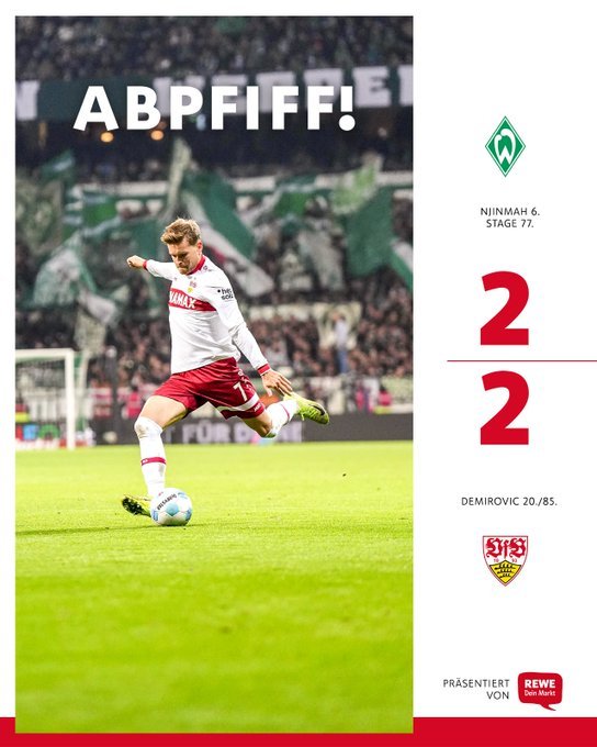 Στο 79’ από ακόμα ένα στημένο ο Στάγκε με δύο προσπάθειες έστειλε την μπάλα στο δοκάρι και στα δίχτυα με το γυριστό σουτ δίνοντας εκ νέου προβάδισμα στην ομάδα της Βρέμης. Έξι λεπτά αργότερα ο Στίλερ πέρασε υπέροχη πάσα στην πλάτη της άμυνας, με τον Ντεμίροβιτς να πλασάρει καταπληκτικά για την ισοφάριση της Στουτγκάρδης.