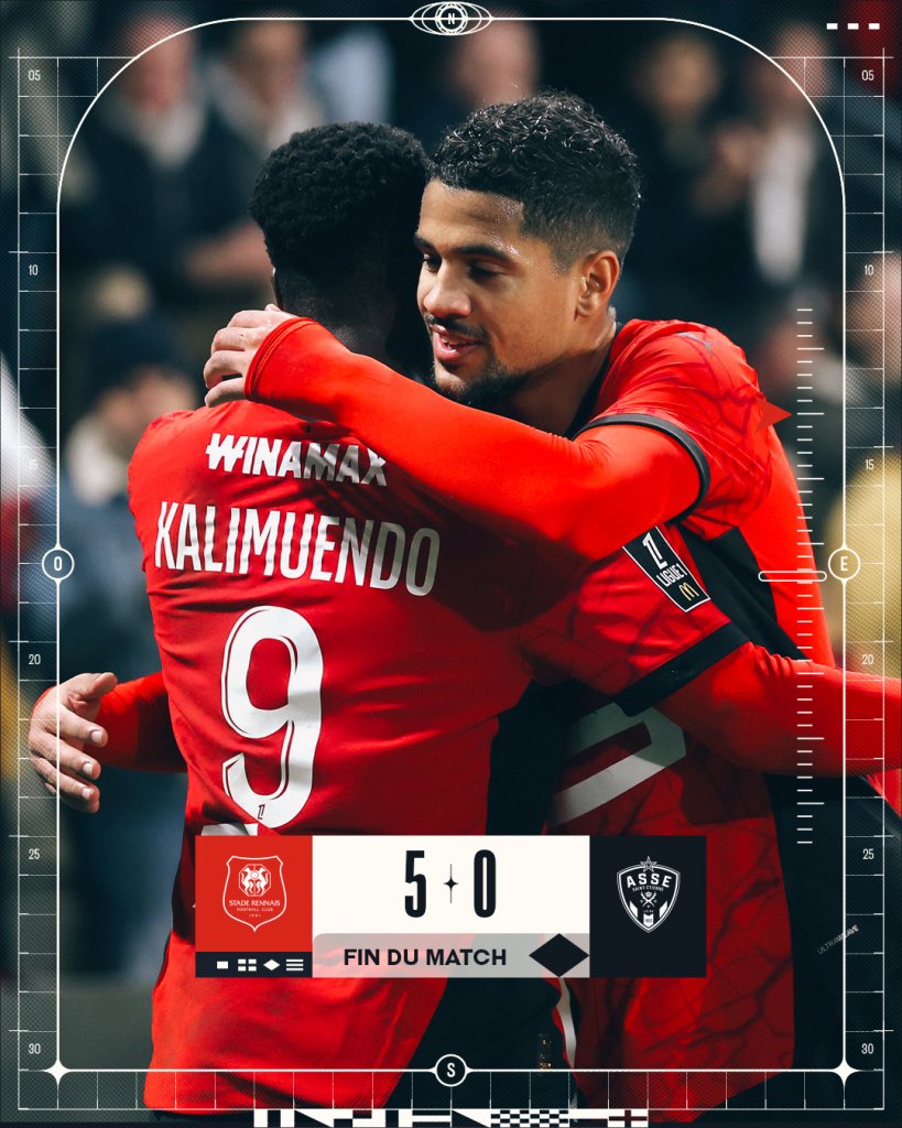 Στο 37', ο Καφάρο έκανε πέναλτι και αποβλήθηκε, με απευθείας κόκκινη. Την εσχάτη των ποινών ανέλαβε ο Καλιμουεντό, ο οποίος άνοιξε το σκορ για τη Ρεν. Στις καθυστερήσεις του ημιχρόνου, ο Καλιμουεντό έδωσε ασίστ στον Λουντοβίκ Μπλας, για το 2-0, με τον σκόρερ του δεύτερου τέρματος να γίνεται ο δημιουργός, για το 3-0, με σκόρερ τον Αμινέ Γκουϊρί στο 53ο λεπτό. Ο Μπλας έδωσε και δεύτερη ασίστ, οκτώ λεπτά αργότερα, για το δεύτερο προσωπικό γκολ του Καλιμουεντό. Στο 67ο λεπτό, με εκτέλεση πέναλτι, ο Καλιμουεντό διαμόρφωσε το τελικό 5-0. Οι γηπεδούχοι είχαν ευκαιρία και για έκτο γκολ, στο τελευταίο δεκάλεπτο, αλλά, ο Άλμπερτ Γκρένμπεκ σημάδεψε το δοκάρι, με τη Ρεν να σκαρφαλώνει στην ενδέκατη θέση, τέσσερις βαθμούς πάνω από τη ζώνη του υποβιβασμού. Πλέον, η Σεντ Ετιέν συμπλήρωσε 14 παιχνίδια μακριά από την έδρα της χωρίς τρίποντο.