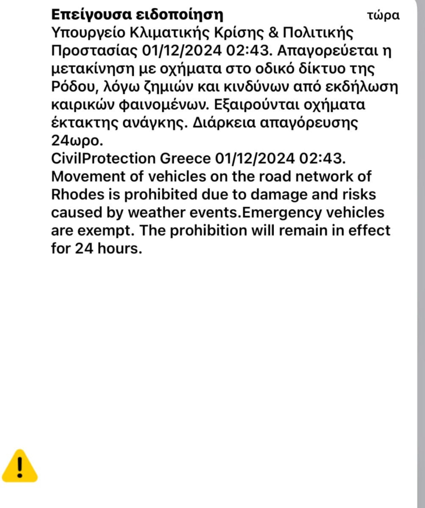 Συγκεκριμένα, το μήνυμα αναφέρει: «Αν βρίσκεστε στην Ιαλυσό Ρόδου απομακρυνθείτε από υπόγειους και ισόγειους χώρους σε υψηλότερα σημεία λόγω πλημμυρικών φαινομένων στην περιοχή. Ακολουθήστε τις οδηγίες των Αρχών».