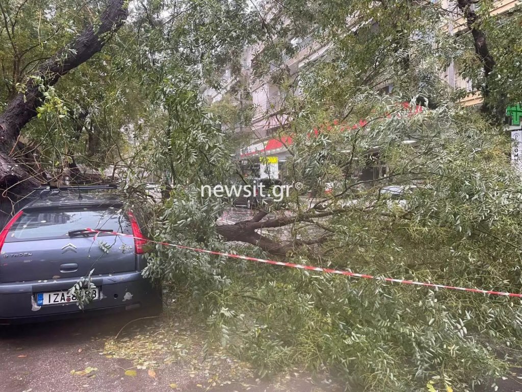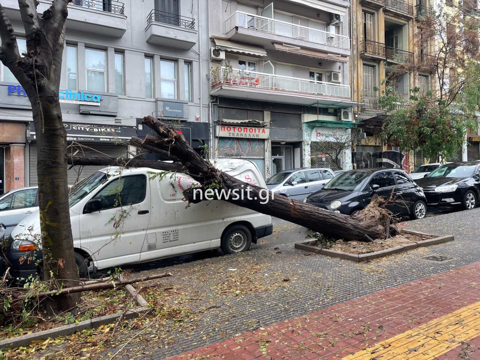Στην πόλη οι ριπές ανέμων φτάνουν κατά διαστήματα τα 95 χλμ./ώρα, έκλεισαν κεντρικοί οδικοί άξονες είτε λόγω υπερχείλισης υδάτων είτε λόγω πτώσεις δένδρων.