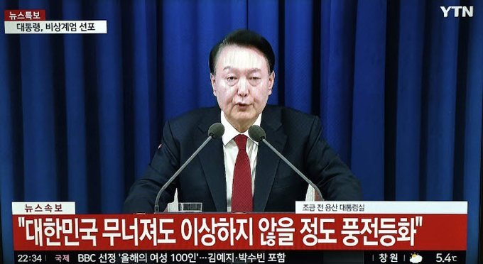 «Κηρύσσω στρατιωτικό νόμο για να προστατεύσω την ελεύθερη Δημοκρατία της Κορέας από την απειλή των βορειοκορεατικών κομμουνιστικών δυνάμεων, να εξαλείψω τις κατάπτυστες φιλοβορειοκορεατικές αντικρατικές δυνάμεις που λεηλατούν την ελευθερία και την ευτυχία του λαού μας και να προστατεύσω την ελεύθερη συνταγματική τάξη», δήλωσε ο ειδικότερα ο πρόεδρος της Νότιας Κορέας.
