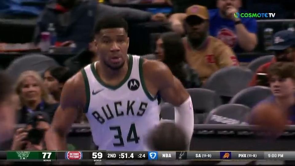 Στη Little Caesars Arena, ο Έλληνας φόργουορντ είχε 3/3 δίποντα και ένα μπλοκ, με τους Μπακς να προηγούνται 31-36. Ο Γιάννης έβλεπε τους συμπαίκτες του να έχουν υψηλά ποσοστά ευστοχίας και φρόντισε να δημιουργεί για εκείνους. Στο τέλος του ημιχρόνου, οι Μπακς προηγούνταν 59-78, με 15/21 τρίποντα.