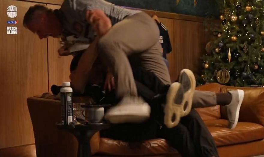 Τότε, ο τρελαμένος Κάραχερ πήδηξε πάνω στον Γκάρι Νέβιλ, φώναζε "δώστε του τώρα ό,τι ζητήσει στο συμβόλαιο", και κατέληξε να πέσει με τούμπα από τον καναπέ στον οποίο είχε σκαρφαλώσει.