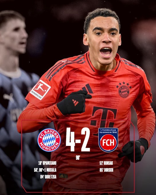 Επιστροφή στις νίκες για την Μπάγερν η οποία κέρδισε με 4-2 τη Χαϊντενχάιμ έχοντας ως πρωταγωνιστή τον Μουσιάλα ο οποίος ήρθε από τον πάγκο και άλλαξε την εικόνα της αναμέτρησης.