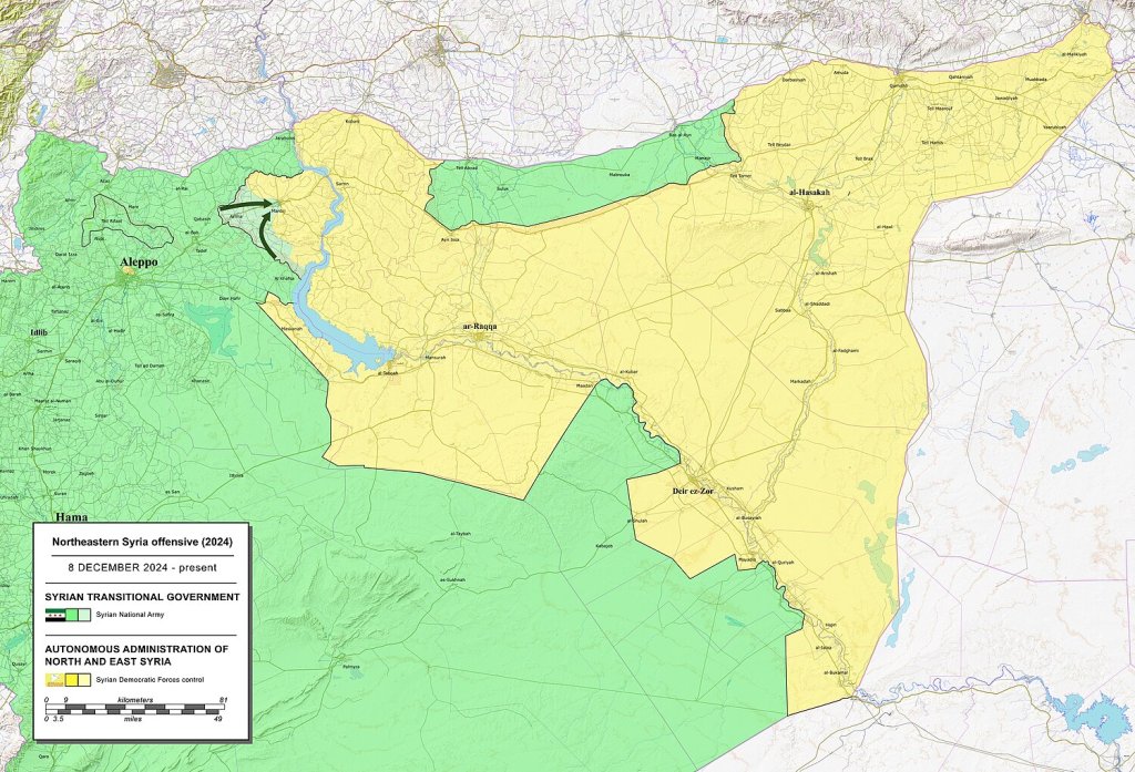 Ενώ οι αντάρτες κατέλαβαν τη Δαμασκό στα βόρεια της Συρίας μαίνεται μια άλλη μάχη μεταξύ των παραστρατιωτικών του SNA, οι οποίοι υποστηρίζονται από την Τουρκία, και των Κούρδων. Το SNA (Συριακός Εθνικός Στρατός) έχει επιτεθεί στην πόλη Μαντζίμπ η οποία ελέγχεται από το κουρδικό SDF. Η Τουρκία εκπαιδεύει και εφοδιάζει το SNA που αποτελεί το «χέρι» της στη Συρία. Χαρακτηριστικό είναι ότι πρόσφατα ο ηγέτης του εθνικιστικού κόμματος της Τουρκίας, σύμμαχος του Ερντογάν, είχε ζητήσει να στοχοποιηθεί η πόλη Μανμπίτζ. Μετά την εκδίωξη του Άσαντ ο Ερντογάν προχωρά στο επόμενο στάδιο του σχεδίου του που είναι η τελική νίκη επί των Κούρδων.