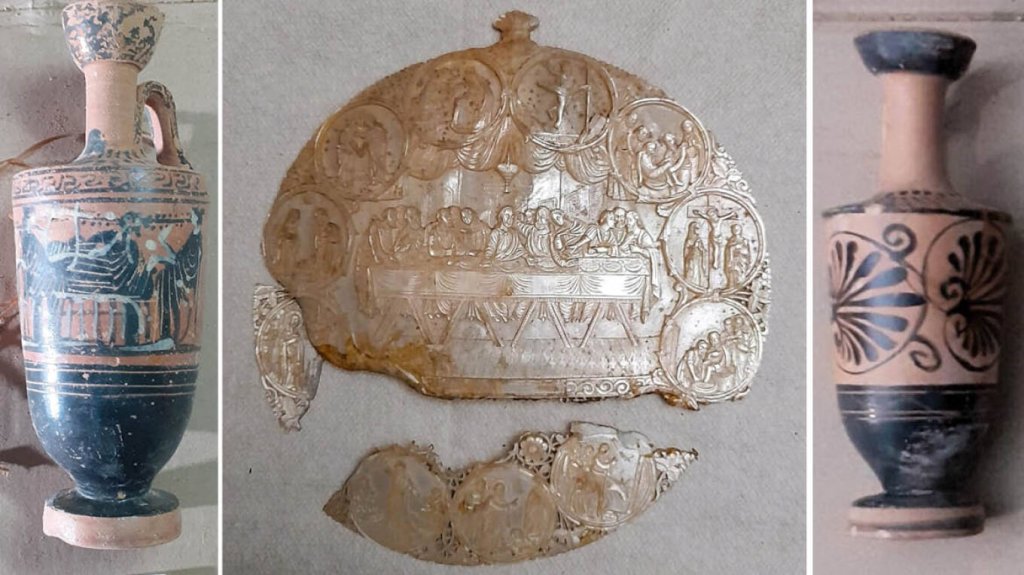 Κατά τον εντοπισμό των αρχαίων αντικειμένων τον Φεβρουάριο του 2024, ο αρμόδιος εκπρόσωπος της Εθνικής Πινακοθήκης - Μουσείου Αλέξανδρου Σούτσου (ΕΠΜΑΣ) ενημέρωσε άμεσα το Υπουργείο Πολιτισμού για τα ευρήματα. Αρχαιολόγοι από τη Διεύθυνση Τεκμηρίωσης και Προστασίας Πολιτιστικών Αγαθών (ΔΤΠΠΑ) και το Νομισματικό Μουσείο πραγματοποίησαν αυτοψία στον χώρο. Εντοπίστηκαν και καταγράφηκαν 102 αρχαία αντικείμενα που χρονολογούνται στους γεωμετρικούς μέχρι τους ελληνιστικούς χρόνους (κύλικες, κάνθαροι, λεκανίδες, λήκυθοι, σκύφοι, ειδώλια κ.α.), 36 αντικείμενα θρησκευτικού χαρακτήρα μεταβυζαντινών χρόνων (εικόνες, ασημένιες επενδύσεις, αρχιερατική ράβδος και άλλα εκκλησιαστικά αντικείμενα), καθώς και 3.247 νομίσματα, μετάλλια, σφραγιδόλιθοι, σταθμία, μολυβδόβουλα που χρονολογούνται από τους αρχαίους έως τους νεώτερους χρόνους.