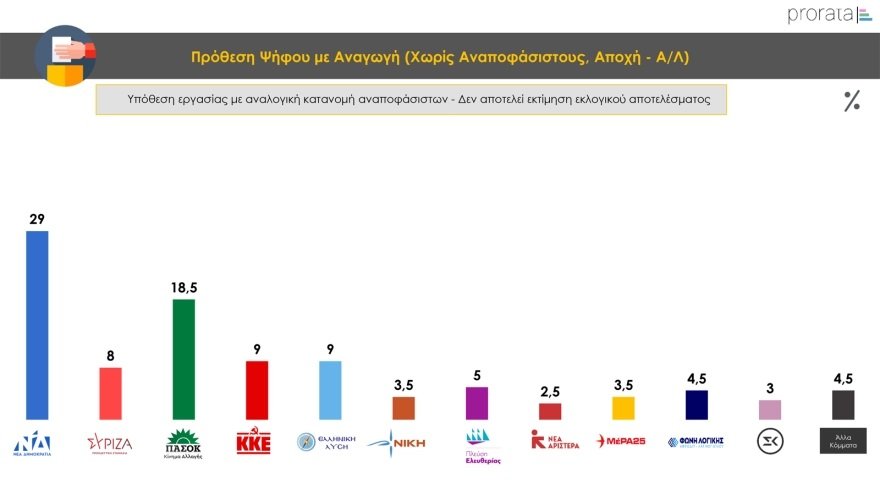 Στην πρόθεση ψήφου με αναγωγή, με αναλογική, δηλαδή, κατανομή των αναποφάσιστων, η ΝΔ εμφανίζεται στο 29%, ακολουθούμενη από το ΠΑΣΟΚ που καταγράφεται στο 18,5%, ενώ στην τρίτη θέση με 9% βρίσκονται ΚΚΕ και Ελληνική Λύση. Ακολουθεί ο ΣΥΡΙΖΑ με 8%, η Πλεύση Ελευθερίας με 5% και η Φωνή Λογικής (Αφροδίτη Λατινοπούλου) με 4,5%. Στο 3,5% καταγράφονται το ΜΕΡΑ 25 και η ΝΙΚΗ, ενώ 3% είναι το ποσοστό του κόμματος Κασσελάκη και 2,5% της Νέας Αριστεράς.
