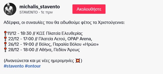 Συναυλία στην πλατεία του Αετού, στη Φιλαδέλφεια, στο γήπεδο της ΑΕΚ θα δώσει ο γνωστός τραγουδιστής και Ενωσίτης, Stavento, την Κυριακή (22/12). Όπως ανακοίνωσε ο ίδιος η συναυλία θα ξεκινήσει στις 5 το απόγευμα, λίγες ώρες πριν την έναρξη του αγώνα με τον Λεβαδειακό (21:00).