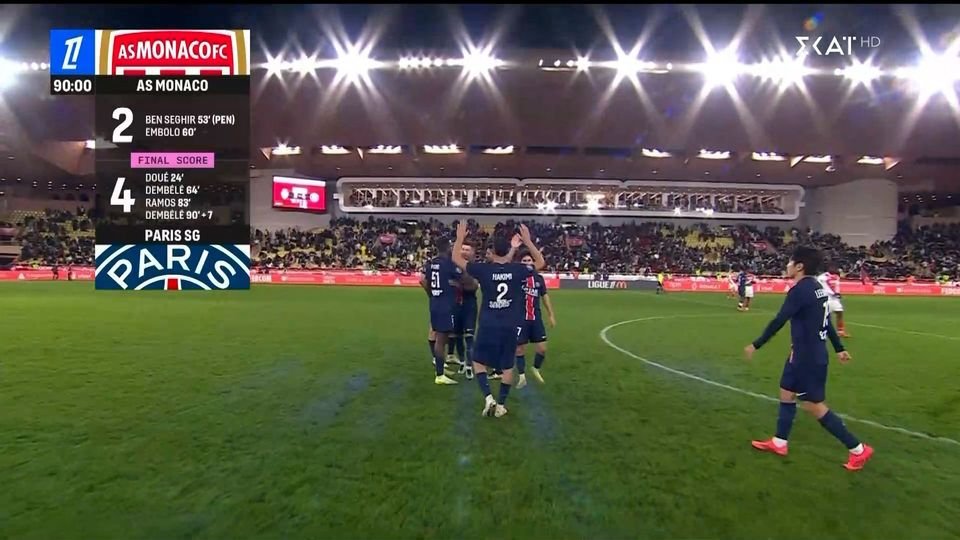 Στο ντέρμπι του Πριγκιπάτου, η Παρί Σεν Ζερμέν νίκησε 4-2 τη Μονακό και ξέφυγε δέκα βαθμούς από τους διώκτες της. Σε αγώνα, που διεξήχθη νωρίτερα από τα υπόλοιπα ματς της 16ης αγωνιστικής, η Παρί άνοιξε το σκορ με τον Ντουέ στο 24ο λεπτό. Η εύστοχη εκτέλεση πέναλτι του Μπεν Σεγκίρ, στο 53', έφερε το ντέρμπι στα ίσα, με τη Μονακό να φτάνει στην ολική ανατροπή, επτά λεπτά αργότερα, όταν ο Εμπολό έκανε το 2-1. Στο 64', η Παρί ισοφάρισε με τον Ντεμπελέ και έκανε το 2-3, με τον Γκονζάλο Ράμος, στο 83ο λεπτό. Στο τέταρτο λεπτό των καθυστερήσεων, ο Ντεμπελέ βρήκε, ξανά, δίχτυα, διαμορφώνοντας το τελικό 2-4.