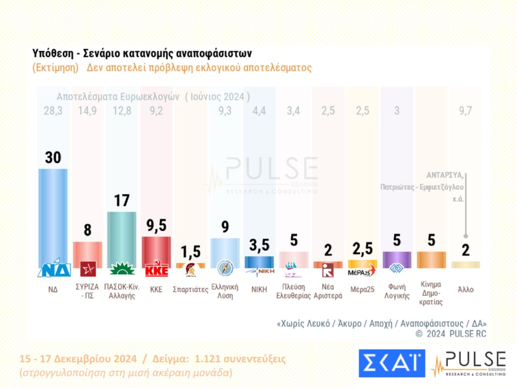 Η μέτρηση δίνει την εικόνα μίας Βουλής εννέα κομμάτων - με τη Νέα Αριστερά και το ΜεΡΑ25 να μένουν εκτός και σε αυτή την δημοσκόπηση. Τα ποσοστά του ΠΑΣΟΚ και του ΣΥΡΙΖΑ δεν παρουσιάζουν διαφοροποίηση σε σχέση με την προηγούμενη δημοσκόπηση της Pulse, ενώ κέρδη εμφανίζουν το ΚΚΕ και η Ελληνική Λύση.