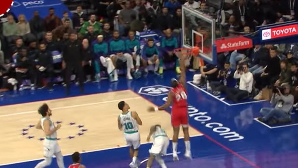 Ο Γκερσόν Γιαμπουσέλε των Φιλαδέλφεια Σίξερς έφυγε στον αιφνιδιασμό και κάρφωσε, κάνοντας poster τον Τζέφρις των Σάρλοτ Χόρνετς, που επιχείρησε να μαρκάρει τον Γάλλο φόργουορντ.