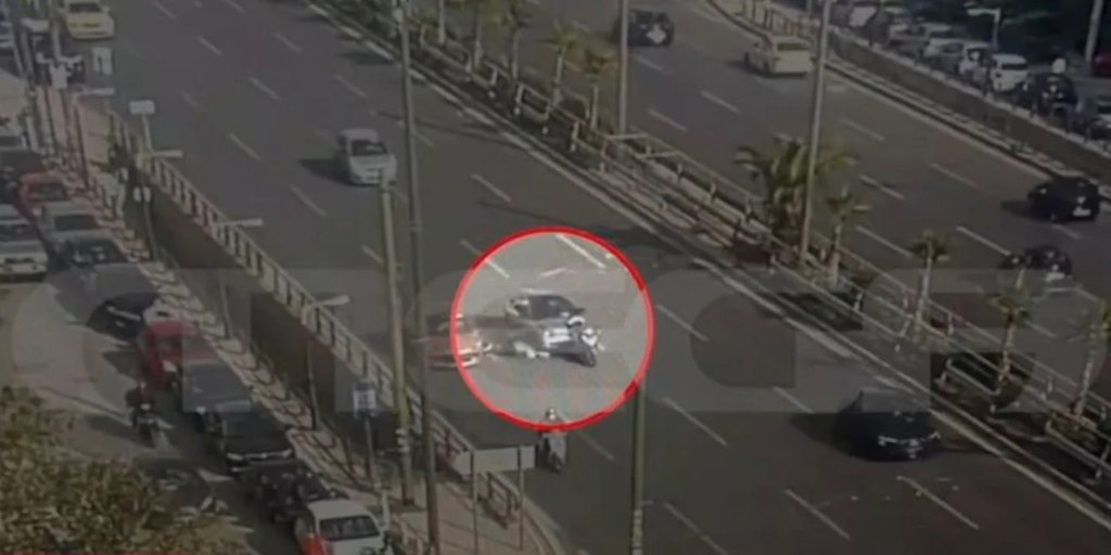 Τότε, ένα αυτοκίνητο που έχει αναπτύξει ταχύτητα, όπως φαίνεσαι και στο βίντεο-ντοκουμέντο, στην προσπάθειά του να αλλάξει λωρίδα παρασέρνει τον ηθοποιό για αρκετά μέτρα.