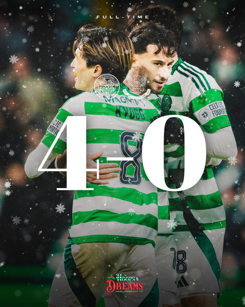 Με περίπατο έκλεισε τις υποχρεώσεις της, για το 2024, η πρωτοπόρος Σέλτικ, συντρίβοντας 4-0 την ουραγό Σεντ Τζόνστον. Διατηρώντας το αήττητό της, στο πρωτάθλημα, η πρωταθλήτρια άνοιξε το σκορ, στο 30ο λεπτό, με τον Νίκολας Κιούν. Ακολούθησαν δυο γκολ, σε διάστημα πέντε λεπτών, από τον Κιόγκο Φουρουχάσι, για να έρθει ο Μαέντα, στο 73ο λεπτό, να διαμορφώσει το τελικό 4-0, σκοράροντας το 51ο γκολ της Σέλτικ σε 18 παιχνίδια πρωταθλήματος.