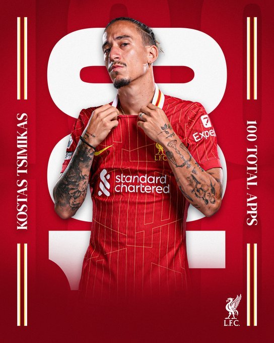 Ο Κώστας Τσιμίκας μπήκε στο club των παικτών της Λίβερπουλ με 100 συμμετοχές, καθώς έφτασε τον τριψήφιο αριθμό αγώνων με τους "reds" στο μεγάλο διπλό στο Λονδίνο. Η Λίβερπουλ αγόρασε τον Τσιμίκα το καλοκαίρι του 2020 από τον Ολυμπιακό αντί 13 εκατομμυρίων ευρώ. Στο παλμαρέ του έχει προσθέσει το Κύπελλο Αγγλίας το 2022 (είχε σκοράρει το τελευταίο πέναλτι στον τελικό με την Τσέλσι), δύο Λιγκ Καπ (2022, 2024) και ένα Community Shield το 2023.