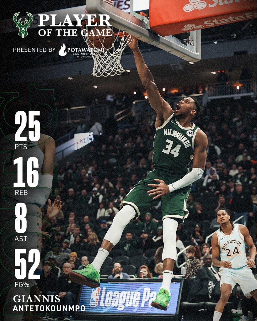 Στην ιστορία των Μιλγουόκι Μπακς, ο Γιάννης Αντετοκούνμπο κατέχει 20 ρεκόρ, μετά και το νέο του επίτευγμα, στη νίκη 121-105 επί των Σαν Αντόνιο Σπερς.