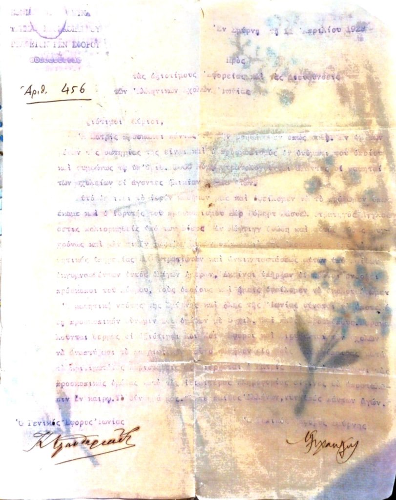 Το πείσμα και η επιμονή του Νίκου Καραμπουρνιώτη, πρώην προέδρου και νυν μέλους του διοικητικού συμβουλίου του Συνδέσμου Μικρασιατών -Κωνσταντινουπολιτών Χαλανδρίου «Ρίζες», έφερε στην επιφάνεια ένα σημαντικό έγγραφο για τον Ελληνισμό της Μικράς Ασίας, έγγραφο το οποίο δημοσιεύεται για πρώτη φορά.
