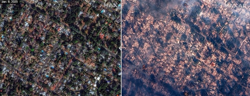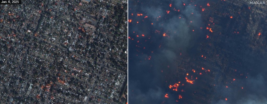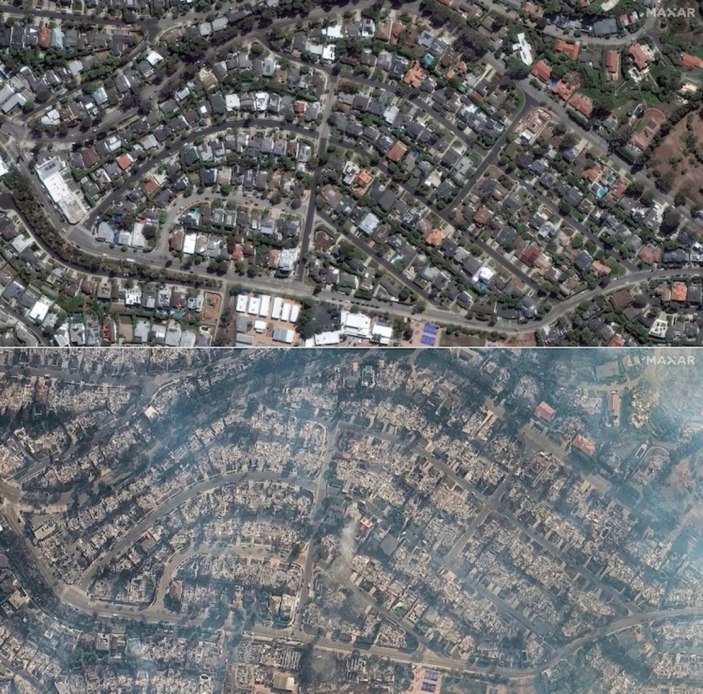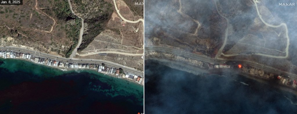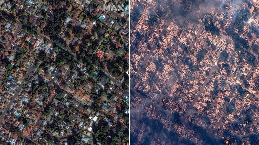Έχουν περάσει τρεις ημέρες από τη στιγμή που ξέσπασαν τα πρώτα μέτωπα και οι δορυφορικές φωτογραφίες της Maxar δείχνουν πώς ολόκληρες συνοικίες -κάποιες μάλιστα με εξαιρετικά ακριβά σπίτια- έχουν γίνει στάχτη και μάλιστα μέσα σε λίγες ώρες.