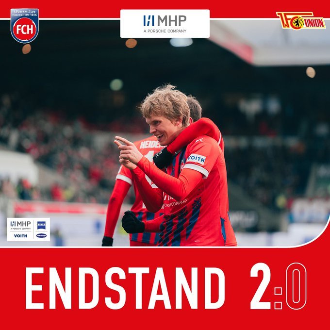 Σπουδαία νίκη για τη Χαϊντενχάιμ η οποία καθάρισε με 2-0 την Ουνιόν των δέκα παικτών και πήρε απόσταση από τις δύο τελευταίες θέσεις της βαθμολογίας.