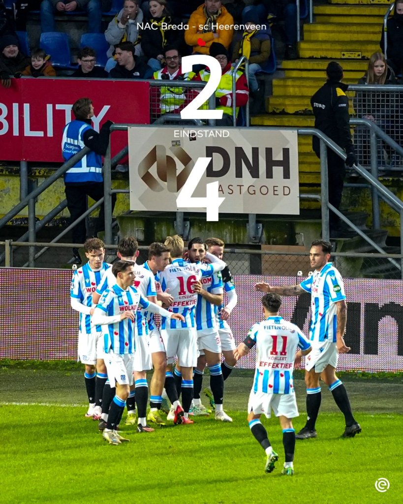 Στην ένατη θέση σκαρφάλωσε η Χέρενφεν, που έκανε το "4 στα 4", απέναντι στη Μπρέντα, νικώντας, εκτός έδρας, 4-2. Ο Γιάκομπ Τρένσκοβ έβαλε μπροστά στο σκορ τη Χέρενφεν, στο 7ο λεπτό, και, έξι λεπτά αργότερα, ο Αλιρέζα Γιαχανμπάκς διπλασίασε τα τέρματα, για την ομάδα του Φαν Πέρσι. Στο 19', από ασίστ του αρχηγού Φαν Ντεν Μπεργκ, ο Ελίας Μαρ Όμαρσον, με κεφαλιά, μείωσε για τη Μπρέντα. Ο αμυντικός Νικολάι Χόπλαντ σκόραρε για το 1-3 της Χέρενφεν. Στην επανάληψη, οι παίκτες της Μπρέντα σημάδεψαν δυο φορές τα δοκάρια, προτού ο Όμαρσον, στο 75ο λεπτό, μειώσει σε 2-3. Λίγο πριν το φινάλε, οι γηπεδούχοι σκόραραν, αλλά, προς ικανοποίηση της Χέρενφεν, το γκολ ακυρώθηκε για οφσάιντ. Το 3-3 δεν έγινε και στο έκτο λεπτό των καθυστερήσεων, ο Ιλίας Σεμπάουι διαμόρφωσε το τελικό 2-4.