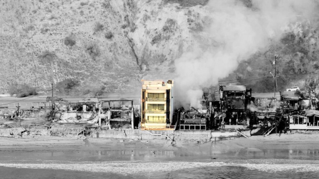 Στην ακτογραμμή του Μαλιμπού, μια από τις ακριβότερες περιοχές κατοικιών στον κόσμο, η εικόνα είναι αποκαρδιωτική. Σχεδόν όλες οι επαύλεις αξίας εκατομμυρίων παραδόθηκαν στις φλόγες και πλέον πίσω έχει μείνει μόνο στάχτη και ερείπια. Ωστόσο, ένα κτήριο συνεχίζεται να στέκεται σχεδόν αλώβητο ανάμεσα στους κατεστραμμένους γείτονές του χωρίς να έχει υποστεί ιδιαίτερες ζημιές και διατηρώντας σχεδόν ατόφιο το λευκό του χρώμα.