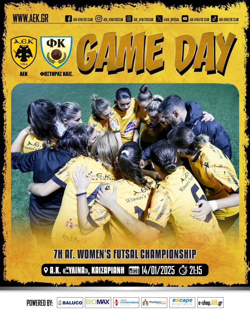 «Η ΑΕΚ ενημερώνει πως ο αποψινός (14/01, 21:15) αγώνας της γυναικείας ομάδας μας Futsal απέναντι στον Φωστήρα Καισαριανής, στο «Α.Κ. Ξύλινα», αναβάλλεται για μεταγενέστερη ημερομηνία λόγω των δυσχερών καιρικών συνθηκών».