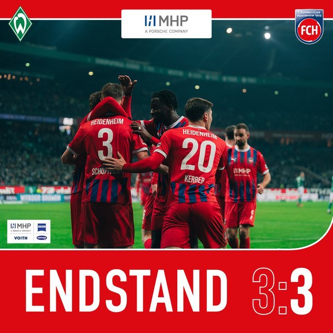 Χορταστική μοιρασιά στη Βρέμη μεταξύ Βέρντερ και Χαϊντενχάιμ (3-3) με τους φιλοξενούμενους να πανηγυρίζουν τον βαθμό στο 90+5' με καταπληκτικό φάουλ. Κρίσιμος βαθμός για τη μάχη της παραμονής για την Χαϊντενχάιμ.