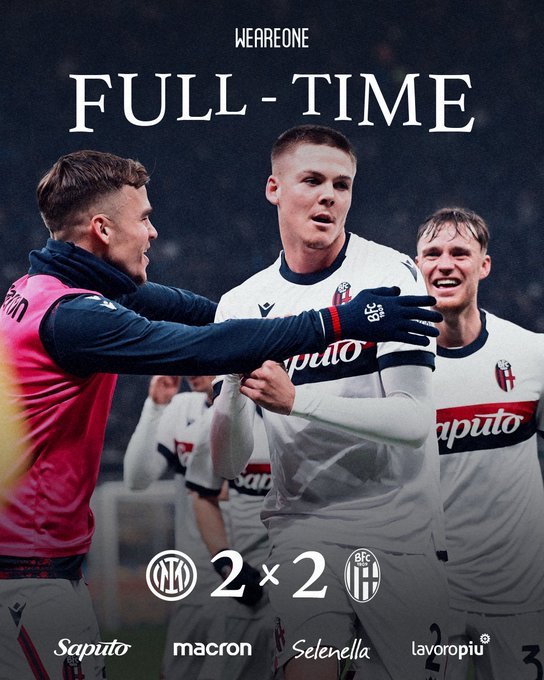 Στοπ στο σερί νικών της Ίντερ (έξι) έβαλε η Μπολόνια, η οποία απέσπασε ισοπαλία 2-2 μέσα στο Μιλάνο, όπως είχε κάνει και πέρσι. Βασικός και από τους καλύτερους της Μπολόνια ο Μπάμπης Λυκογιάννης. Στο -3 από την πρωτοπόρο Νάπολι αλλά με ένα ματς λιγότερο η Ίντερ.