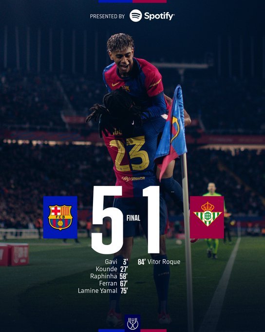 Στο 3ο μόλις λεπτό ο Γκάβι άνοιξε το σκορ για την Μπαρτσελόνα με σουτ από το πέναλτι και στο 27’ ο Κουντέ με πανέμορφο σουτ από πλάγια δεξιά έκανε το 2-0. Στο 56’ ακυρώθηκε γκολ του Γιαμάλ αλλά στο 58’ μετά από αντεπίθεση ο Ραφίνια έγραψε το 3-0 με σουτ από κοντά. Στο 67’ ο Φεράν έκανε το 4-0 με διαγώνιο σουτ από δεξιά και στο 75’ ο Γιαμάλ πάτησε περιοχή από δεξιά και πλάσαρε μες το αριστερό για το 5-0. Στο 84’ η Μπέτις μείωσε με το πέναλτι του Βίτορ Ρόκε.
