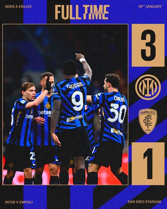 Η Ίντερ κέρδισε με 3-1 την Έμπολι, βρέθηκε ξανά στο -3 από την πρωτοπόρο Νάπολι κι έχει κι ένα ματς λιγότερο.