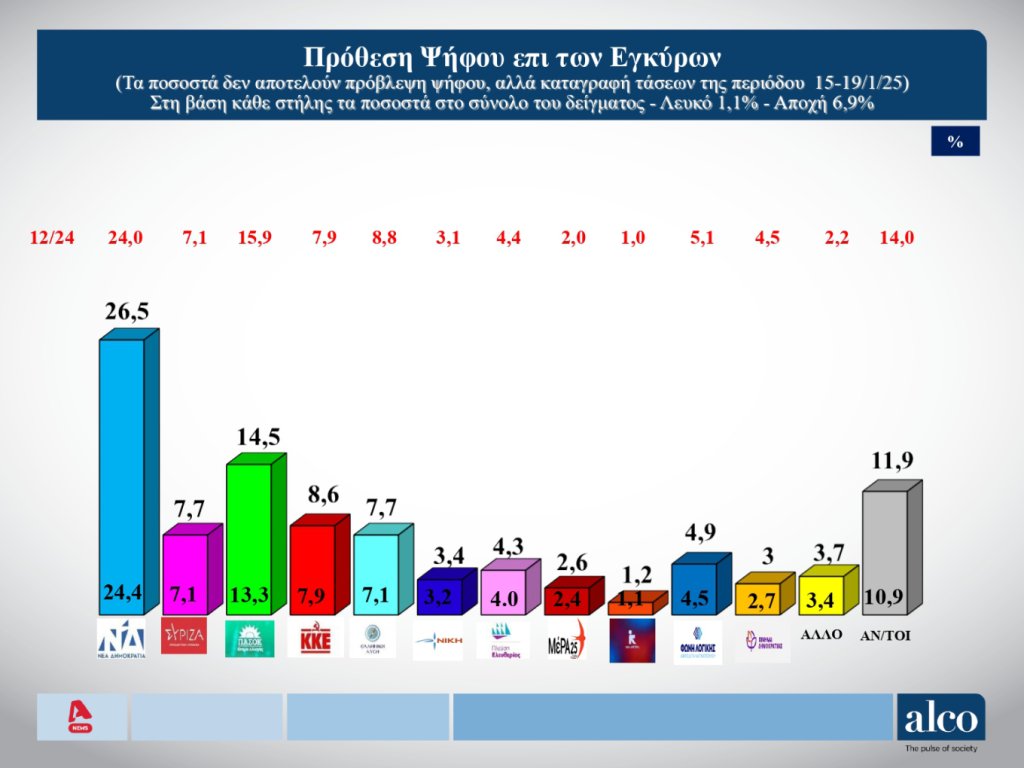 Ανοδο 2,5 μονάδων για τη ΝΔ σε σχέση με τις αρχές του Δεκεμβρίου κατέγραψε η ALCO σε δημοσκόπηση που παρουσιάστηκε στο κεντρικό δελτίο του Alpha. Αντίθετα, το ΠΑΣΟΚ «έγραψε» πτώση σχεδόν 1,5 μονάδων,.
