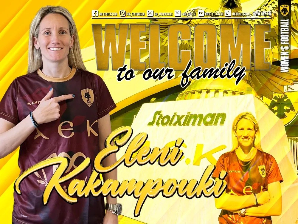 "Η ΑΕΚ βρίσκεται στην ευχάριστη θέση να ανακοινώσει την έναρξη της συνεργασίας της με την Ελένη Κακαμπούκη. Η Ελένη είναι γεννημένη στις 10 Μαΐου του 1987 και θα ενισχύσει το Ποδόσφαιρο Γυναικών του Συλλόγου.