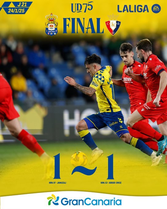 Παλικαρίσιος βαθμός για την Λας Πάλμας. Η ομάδα από τα Κανάρια Νησιά, παρά το γεγονός πως έμεινε πίσω στο σκορ στο 53' και έπαιξε απο το 70ο λεπτό με παίκτη λιγότερο, δεν το έβαλε κάτω και με απευθείας εκτέλεση φάουλ του Αντνάν Γιανουζάι στο 90+7' κατάφερε να σώσει τον βαθμό της ισοπαλίας κόντρα στην Οσασούνα(1-1). Αγνοούν το τρίποντο απο τις 2 Νοεμβρίου οι φιλοξενούμενοι!