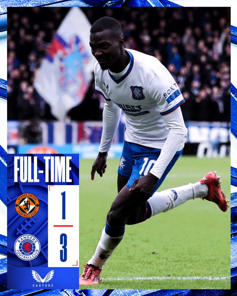 Μετά την ήττα στο "Ολντ Τράφορντ", για τη League Phase του Europa League, η Ρέιντζερς έδωσε συνέχεια στο αήττητο σερί της, στο πρωτάθλημα, νικώντας, εκτός έδρας, 3-1 τη Νταντί Γιουνάιτεντ. Η Ρέιντζερς εδραιώνεται στη δεύτερη θέση, αφού βρίσκεται 13 βαθμούς μπροστά από τη τρίτη Νταντί Γιουνάιτεντ. Παράλληλα, ελπίζει για πρωτάθλημα, αφού βρίσκεται στο -10 από τη πρωτοπόρο Σέλτικ, έχοντας, ωστόσο, ματς περισσότερο.