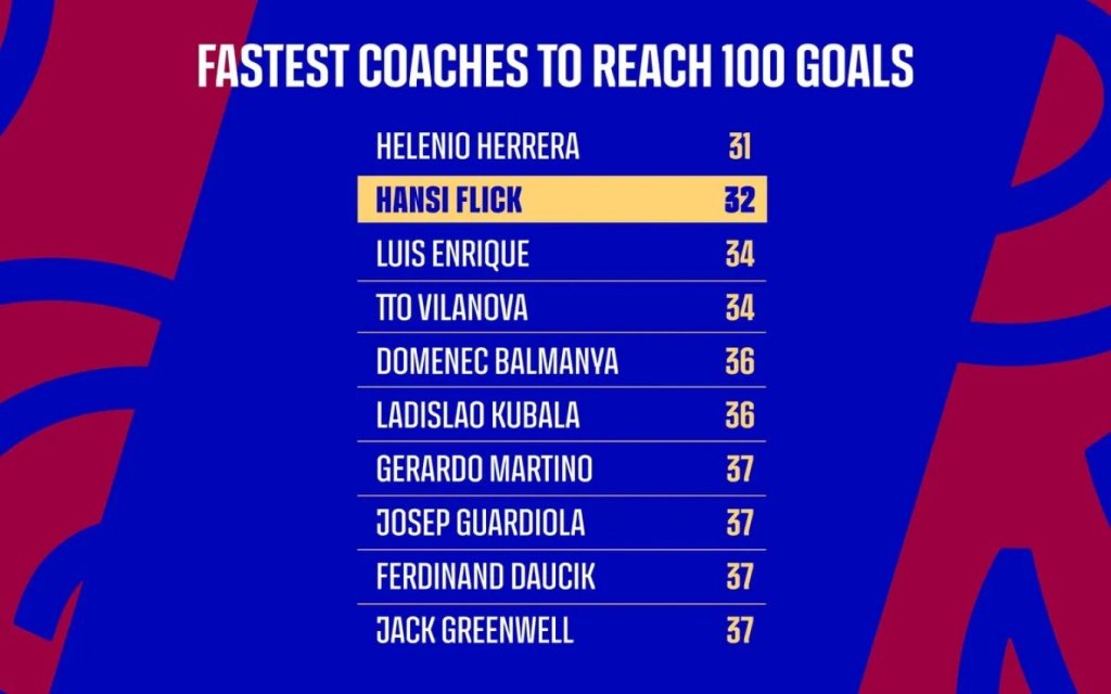 Ο Γερμανός προπονητής Χάνσι Φλικ κατέγραψε αυτό το ρεκόρ γρηγορότερα από θρύλους της Μπαρτσελόνα όπως οι Λουίς Ενρίκε (34 αγώνες), Τίτο Βιλανόβα (34), Ντομένεκ Μπαλμάνια (36), Λάντισλαο Κουμπάλα (36) και Πεπ Γκουαρδιόλα (37).
