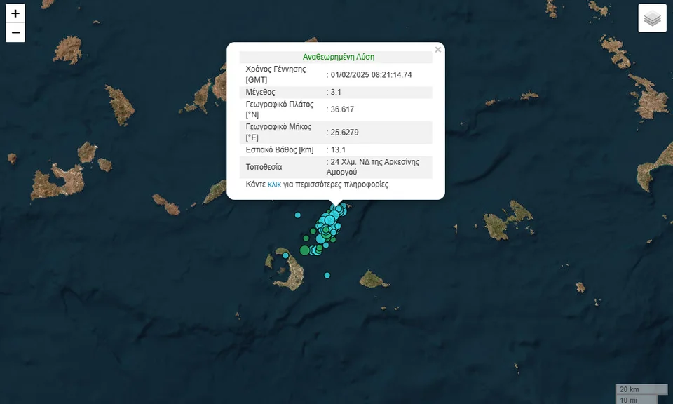 Η πρώτη σεισμική δόνηση σημειώθηκε 24 χλμ νοτιοδυτικά της Αρκεσίνης Αμοργού, είχε μέγεθος 3,1 βαθμούς της κλίμακας Ρίχτερ και εστιακό βάθος 13,1 χιλιομέτρων.