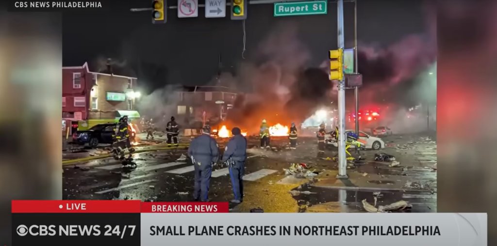 Στις εικόνες διακρίνεται το δικινητήριο αεροσκάφος να κάνει μια απότομη βουτιά, προτού προσκρούσει στο έδαφος και σημειωθεί έκρηξη, ενώ ξέσπασε φωτιά σε πολλά κτίρια και οχήματα στην περιοχή πέριξ του εμπορικού κέντρου Roosevelt Mall στη βορειοανατολική Φιλαδέλφεια.