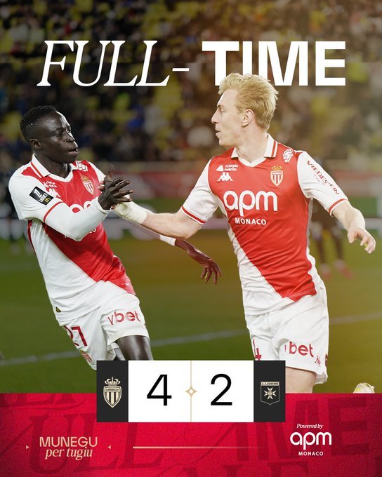 Η Μονακό άνοιξε το σκορ στο 36’ με τον Κέρερ αλλά δύο λεπτά μετά ο Ντιομαντέ ισοφάρισε σε 1-1. Μάλιστα στο 45+8’ ο Τζουμπάλ έκανε το 1-2 με πέναλτι αλλά ο Μπίερεθ ισοφάρισε σε 2-2 στο 58’. Ο ίδιος έκανε το 3-2 στο 63’ και στο 66’ ολοκλήρωσε ένας απίθανο χατ τρικ για το 4-2.