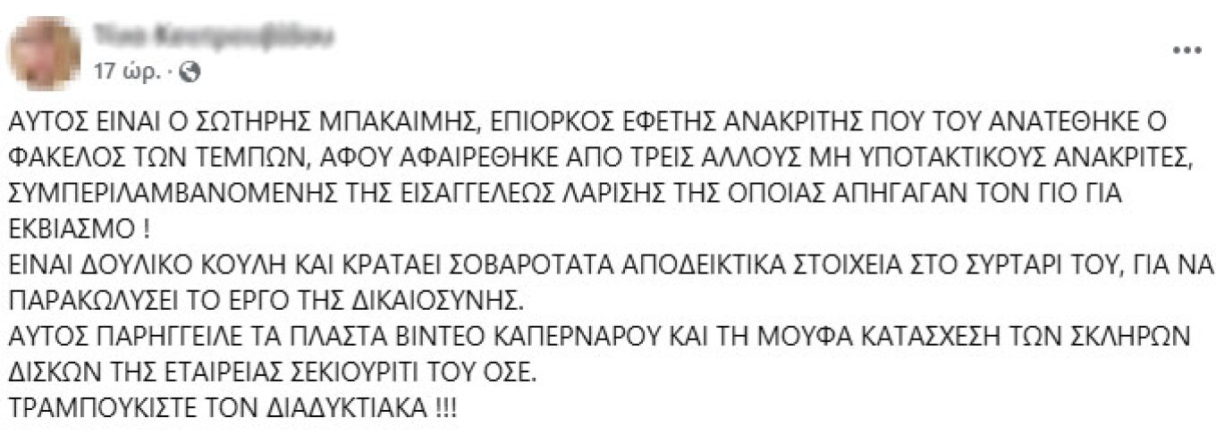 Η ανάρτηση, η οποία επισυνάπτεται, γίνεται στα μέσα κοινωνικής δικτύωσης από την Τ.Κ (τα στοιχεία της αναγράφονται σ’ αυτήν) και έχει το εξής περιεχόμενο: Εικονίζεται από ο Εφέτης Ανακριτής της υπόθεσης των Τεμπών και αναγράφεται: ΑΥΤΟΣ ΕΙΝΑΙ Ο ΣΩΤΗΡΗΣ ΜΠΑΚΑΙΜΗΣ ΕΠΙΟΡΚΟΣ ΕΦΕΤΗΣ ΑΝΑΚΡΙΤΗΣ ΠΟΥ ΤΟΥ ΑΝΑΤΕΘΗΚΕ Ο ΦΑΚΕΛΟΣ ΤΩΝ ΤΕΜΠΩΝ, ΑΦΟΥ ΑΦΑΙΡΕΘΗΚΕ ΑΠΟ ΤΡΕΙΣ ΑΛΛΟΥΣ ΜΗ ΥΠΟΤΑΚΤΙΚΟΥΣ ΑΝΑΚΡΙΤΕΣ, ΣΥΜΠΕΡΙΛΑΜΒΑΝΟΜΕΝΗΣ ΤΗΣ ΕΙΣΑΓΓΕΛΕΩΣ ΛΑΡΙΣΗΣ ΤΗΣ ΟΠΟΙΑΣ ΑΠΗΓΑΓΑΝ ΤΟΝ ΓΙΟ ΓΙΑ ΕΚΒΙΑΣΜΟ! ΕΙΝΑΙ ΔΟΥΛΙΚΟ ΚΟΥΛΗ ΚΑΙ ΚΡΑΤΑΕΙ ΣΟΒΑΡΟΤΑΤΑ ΑΠΟΔΕΙΚΤΙΚΑ ΣΤΟΙΧΕΙΑ ΣΤΟ ΣΥΡΤΑΡΙ ΤΟΥ, ΓΙΑ ΝΑ ΠΑΡΑΚΩΛΥΣΕΙ ΤΟ ΕΡΓΟ ΤΗΣ ΔΙΚΑΙΟΣΥΝΗΣ. ΑΥΤΟΣ ΠΑΡΗΓΓΕΙΛΕ ΤΑ ΠΛΑΣΤΑ ΒΙΝΤΕΟ ΚΑΠΕΡΝΑΡΟΥ ΚΑΙ ΤΗ ΜΟΥΦΑ ΚΑΤΑΣΧΕΣΗ ΤΩΝ ΣΚΛΗΡΩΝ ΔΙΣΚΩΝ ΤΗΣ ΕΤΑΙΡΕΙΑΣ ΣΕΚΙΟΥΡΙΤΙ ΤΟΥ ΟΣΕ. ΤΡΑΜΠΟΥΚΙΣΤΕ ΤΟΝ ΔΙΑΔΥΚΤΙΑΚΑ!!!